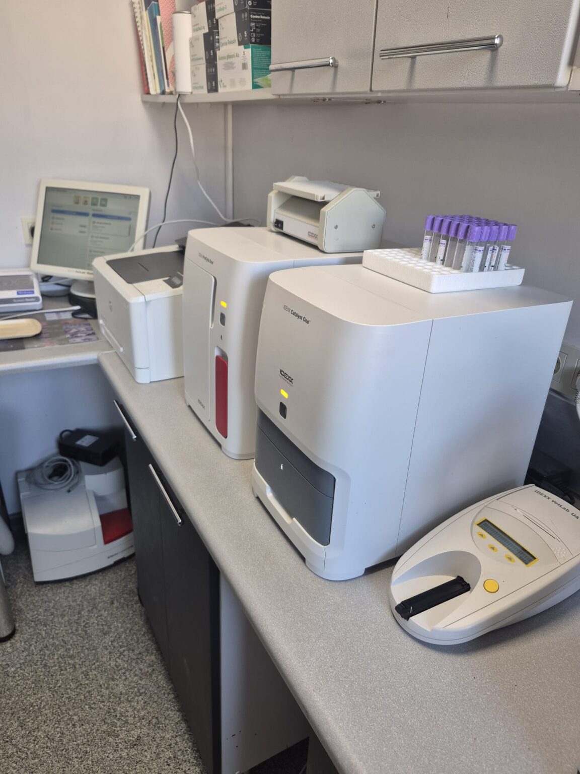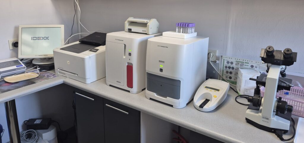 Mūsu klīnikā ir pieejams moderns aprīkojums – profesionāls Idexx un Virbac laboratorijas aprīkojums dažādu analīžu un testu veikšanai, aparatūra mikroskopijas veikšanai, rentgens, sonogrāfija, ultraskaņas aparāts zobu tīrīšanai un pulēšanai, elektroskalpelis un inhalācijas narkozes ierīce.